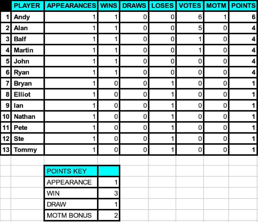 Andy received 6 votes and is this weeks man of the match. Pulled off some good saves at crucial times. Alan should feel unlucky not to be MOTM this week as he was pretty awesome at the back and deserves a special mention.