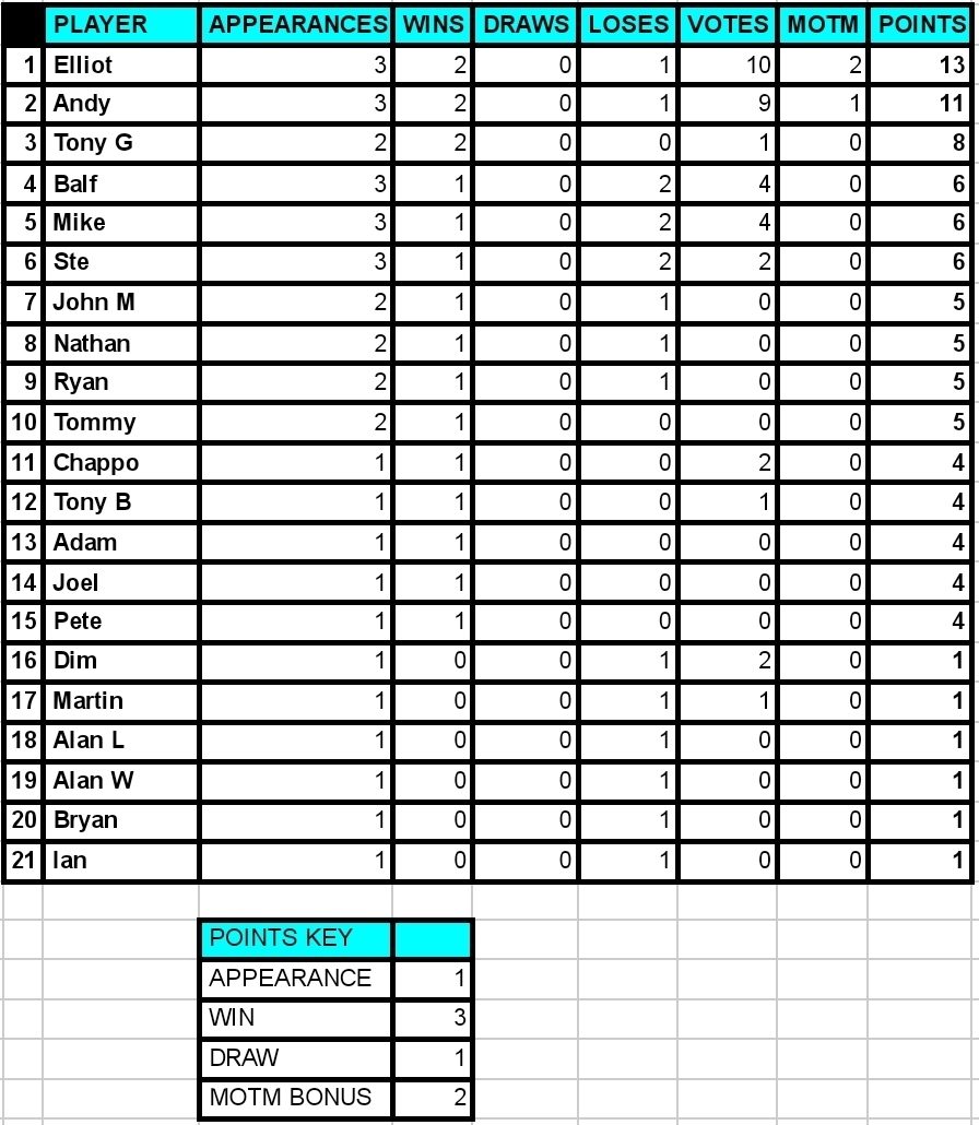 Elliot was quick to capitalise on the mistakes with some excellent finising again and his high pressing caused problems for the opposition. Another good performance which takes him top of the league, well played Elliot!