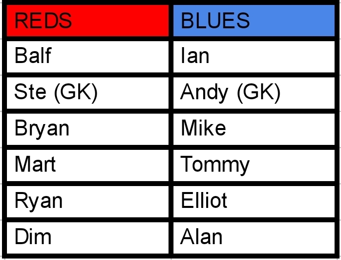The Reds made is difficult for the Blues with Balf and Ryan disciplined at the back and organising the team to be a defensive unit. With Elliot and Mike working their socks off but constantly being doubled up, the Blues best chance of scoring was creating space for Ian in the middle who was looking to smash the ball with his lethal left foot.