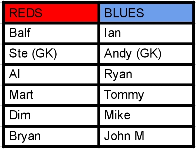 To be fair to Tommy and Ryan they were actually playing really well in defence, they were just outnumbered several times. Mike, John and Ian were working hard but struggled to get back when the Reds countered. The Blues tried to regroup but were finding it hard to get through the Reds defence. When they did, Ste seemed to be saving everything. The Reds kept on playing their football and they had built up an impressive 6 goal lead.