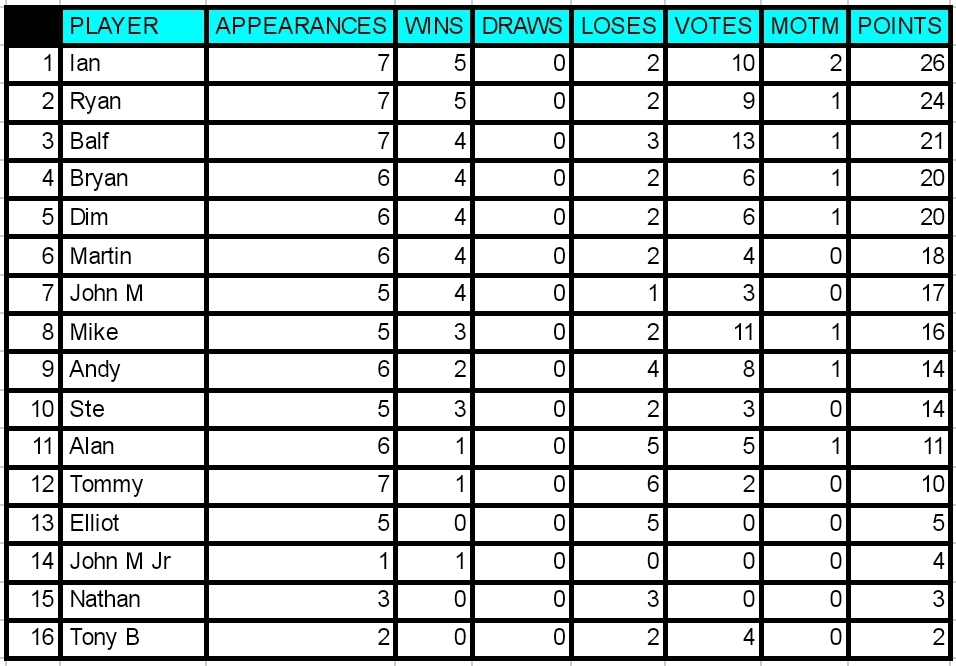 With 4 votes each Alan and Ian are the MOTM this week!
