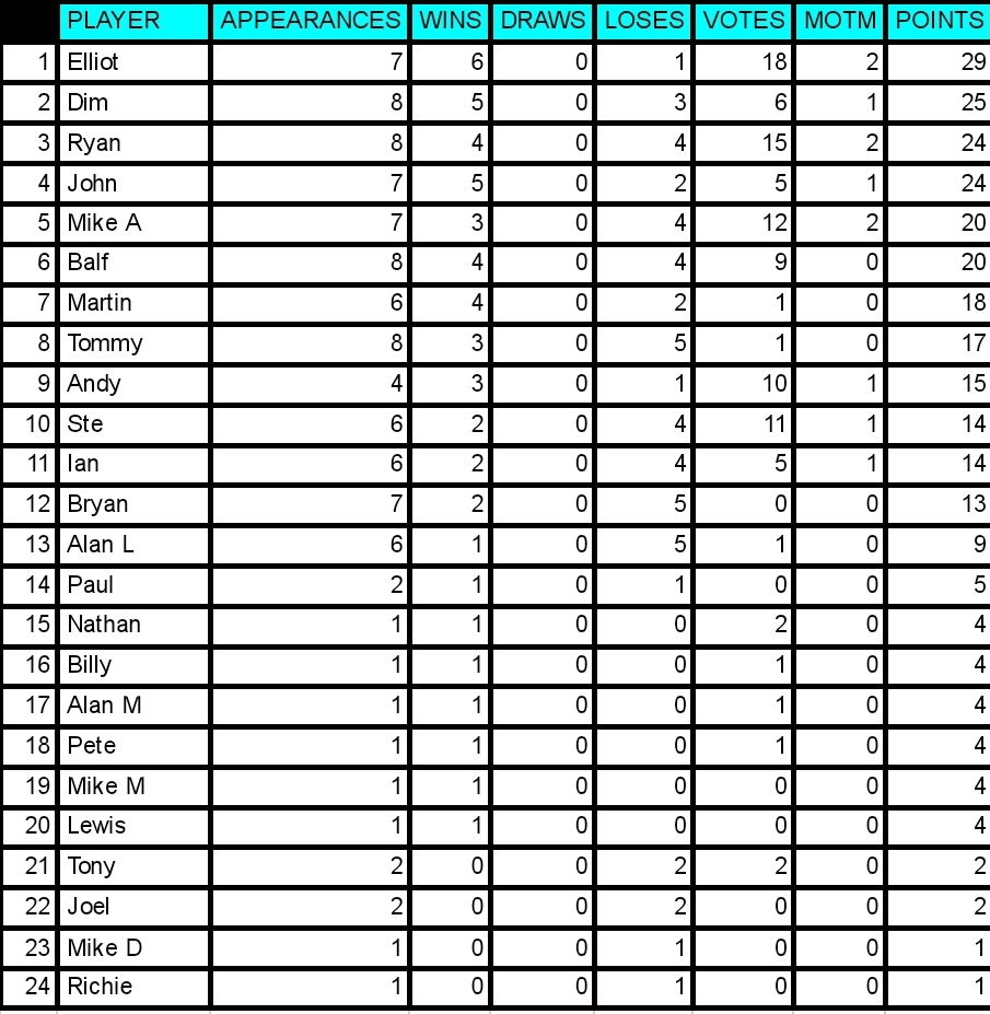 With 6 votes Ryan gets his 2nd MOTM of the season to shoot himself into 3rd spot and a real chance of winning season 7! Well done Ryan!