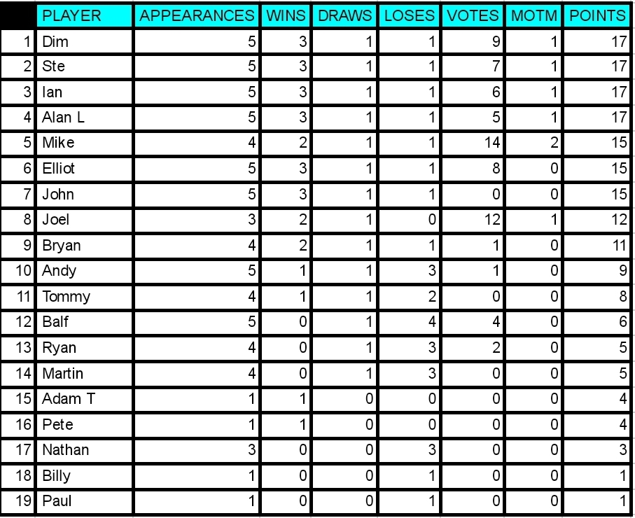 Mike and Ian are the captains with only 1 point separating them, and several players not too far behind. Looks like we are in for the closest season yet!