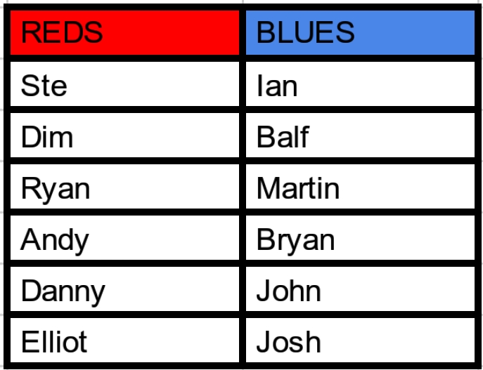 Ste was solid all game at the back, Martin never stopped running all game and was a nuisance to the Reds, Balf put in a great workmanlike performance to help the Blues gain a draw, and Andy & Bryan both made some decent saves. Each received 2 votes each meaning all five claim man of the match and the bonus 2 points.