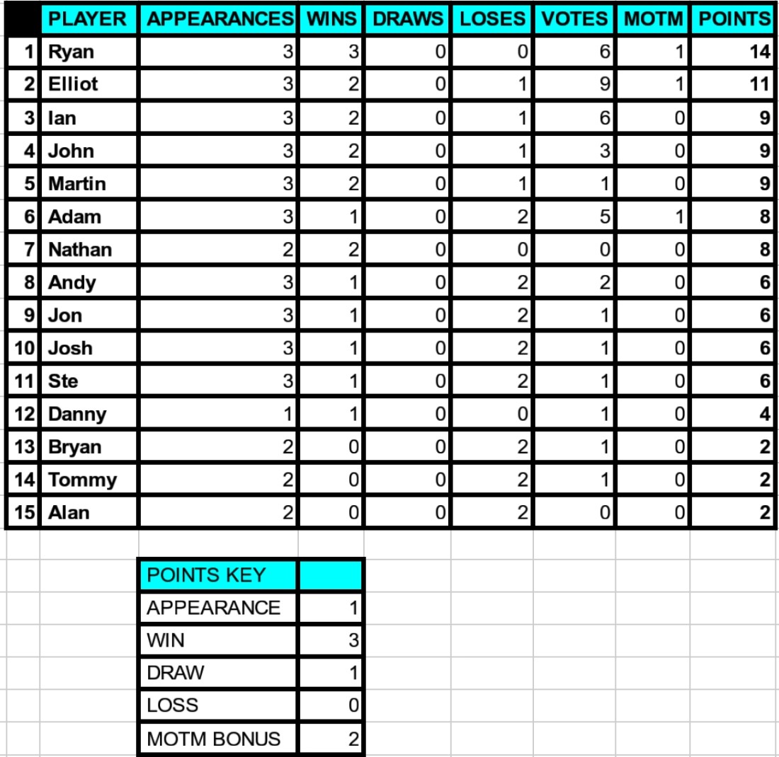 As requested by the league members, Josh gets 2 points for giving up his place this week so others can play. Thanks Josh.