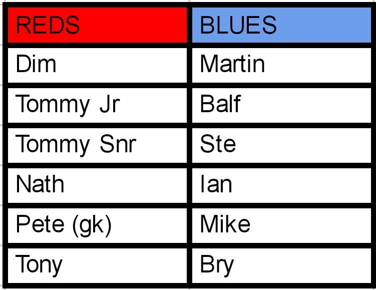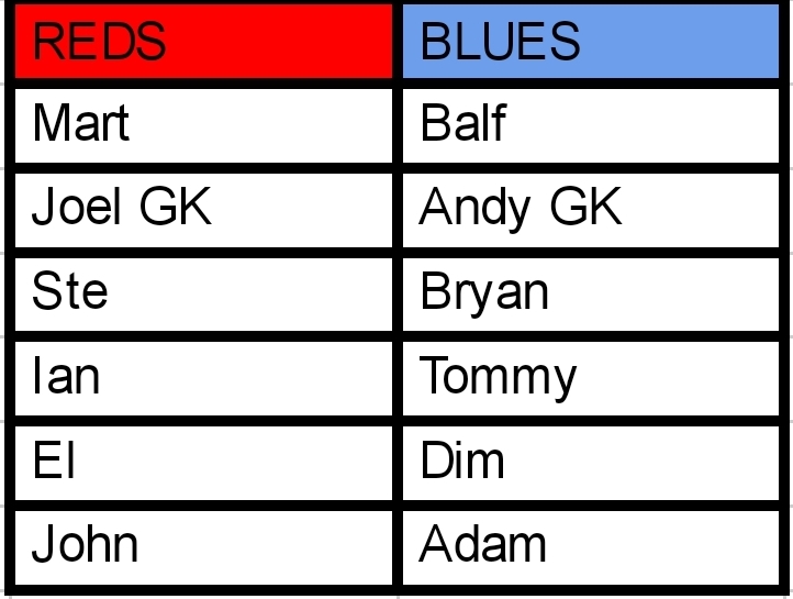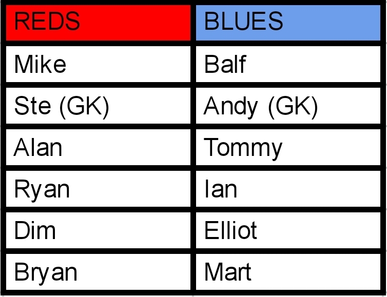 The game was level at 6 all for what seemed like an age. Andy managed to intercept a sloppy pass and score what looked like to be the winner due to the games lack of goals. But the Reds hit straight back and went 1 up, again thanks to Mike. The Reds had a great spell and were playing terrific football, however they were up against an inspired and angry goalkeeper in Ryan who was pulling off some great saves.
