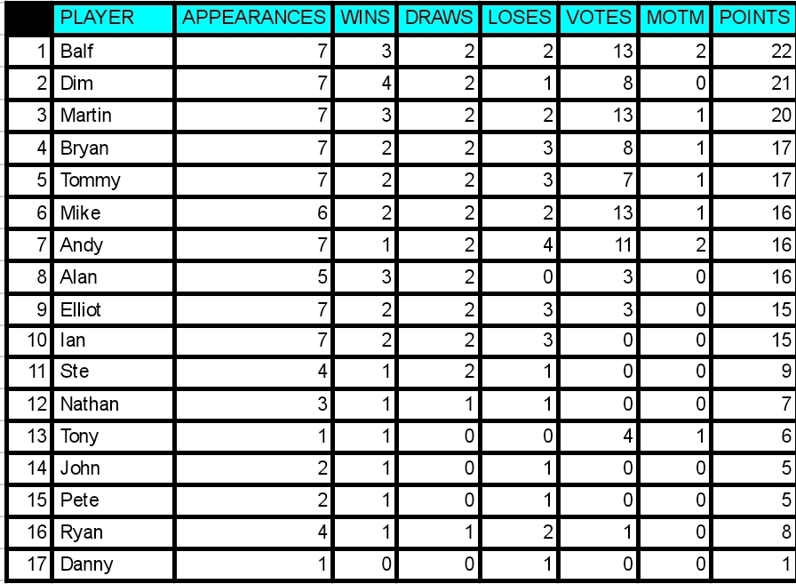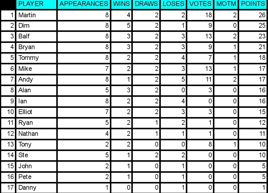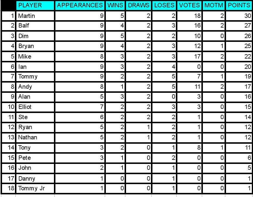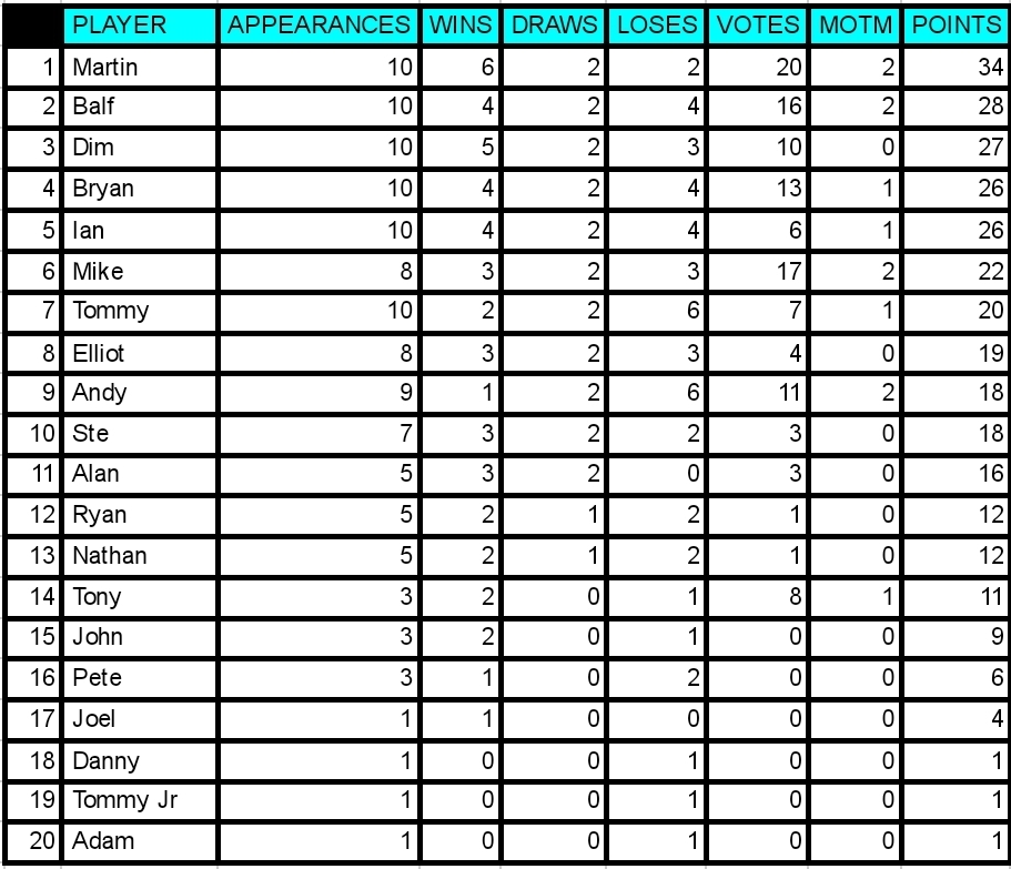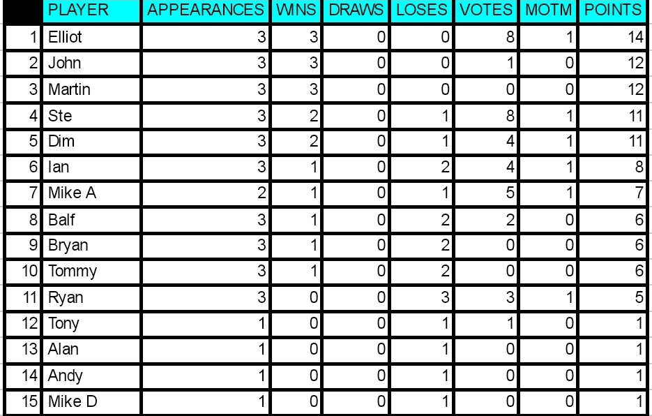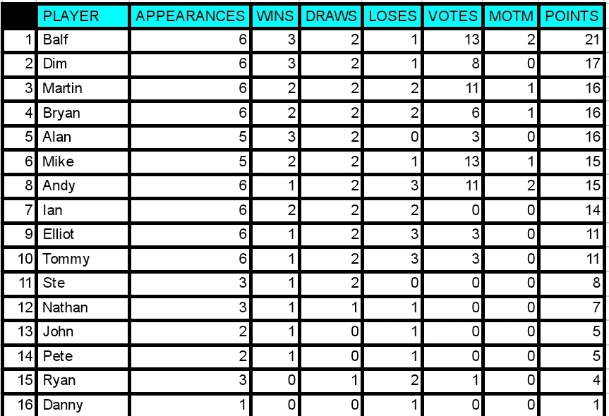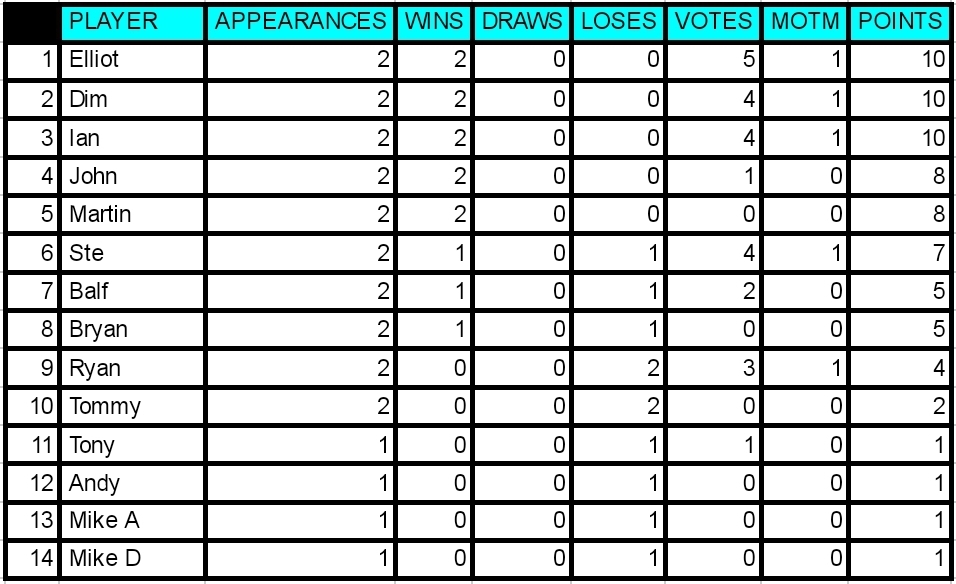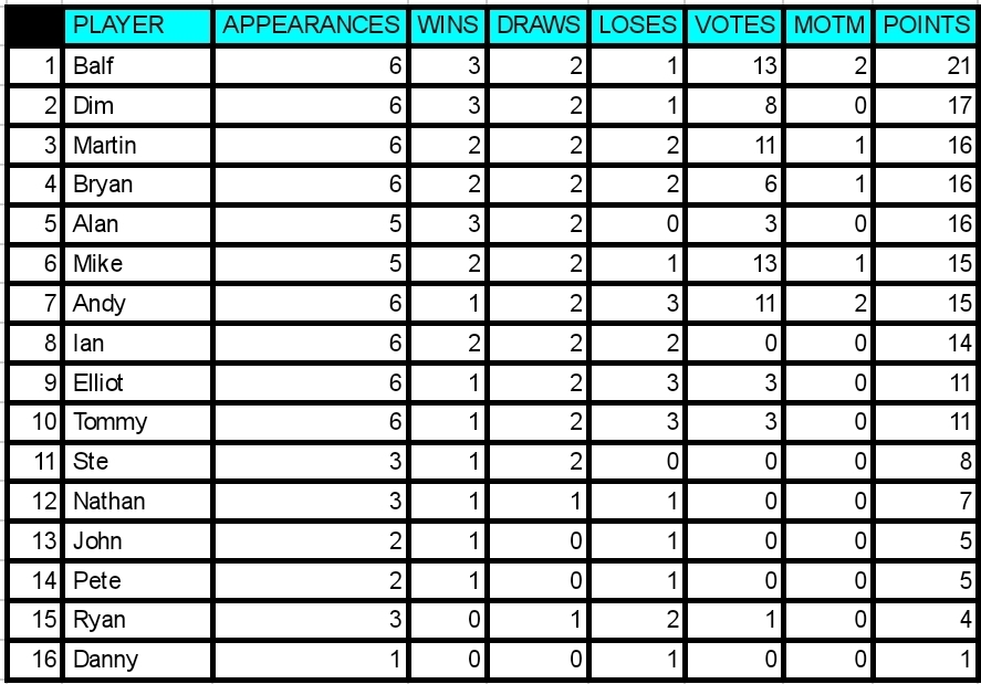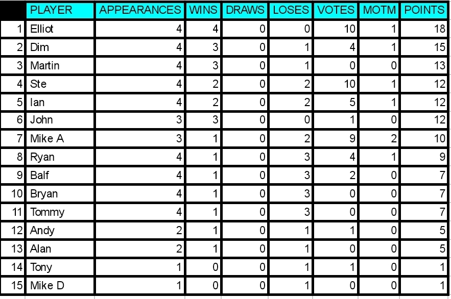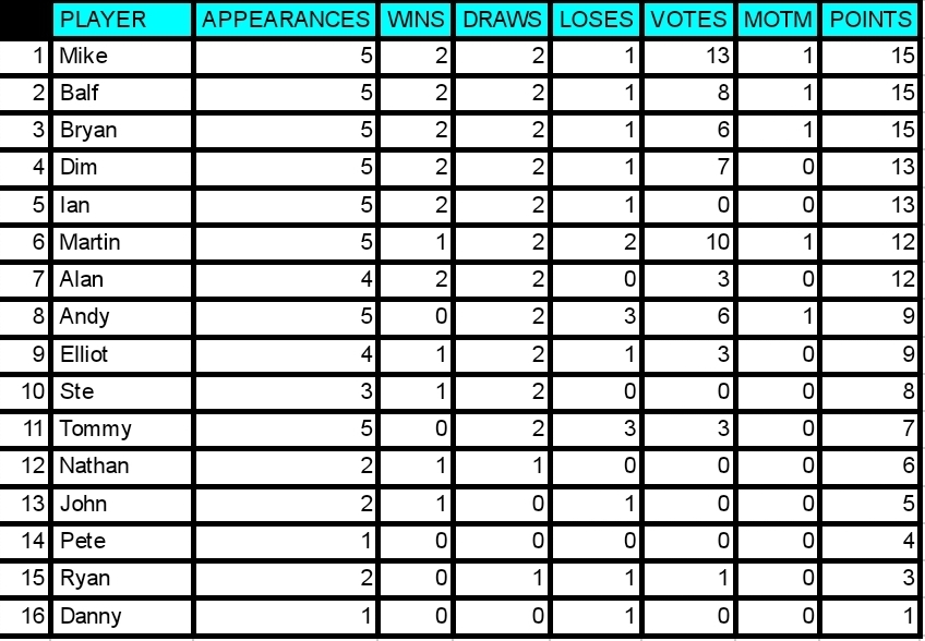 With 4 votes Mike gets MOTM for the 2nd week running. Despite getting lumps kicked out of him he kept going and came up with some important goals. Unlucky to be on the losing team as he was definately the stand out player. Well played Mike! 2 bonus points is a nice consolation!